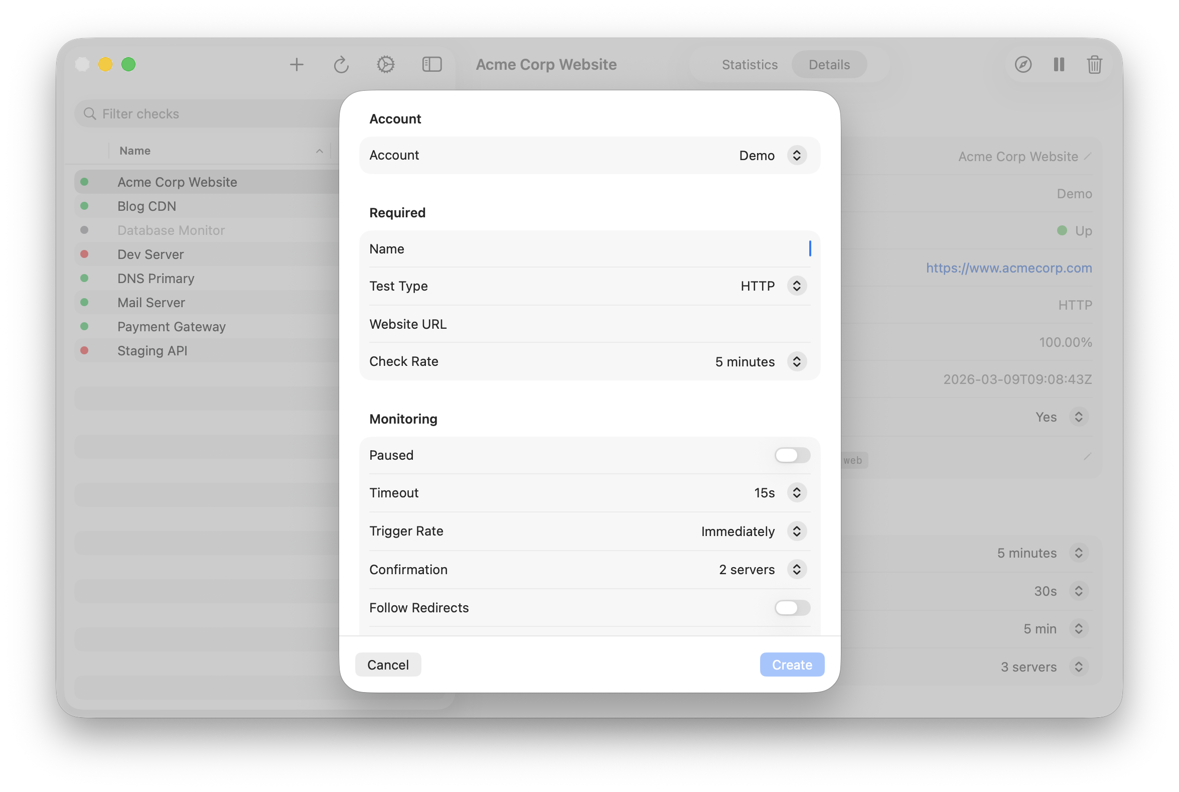Set up new HTTP, HEAD, TCP, DNS, PING, SMTP, or SSH checks with full configuration. Edit any field inline without leaving the app.