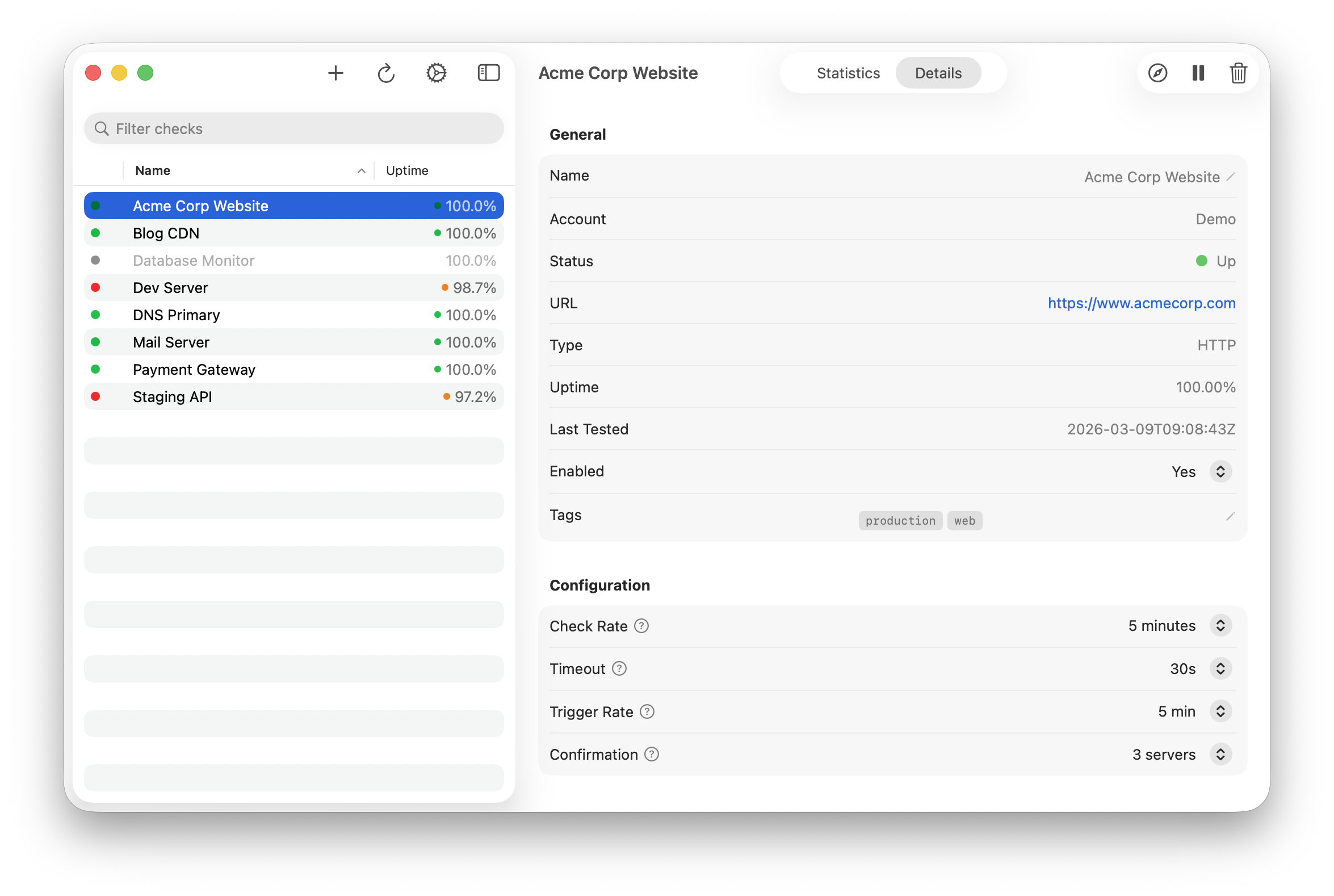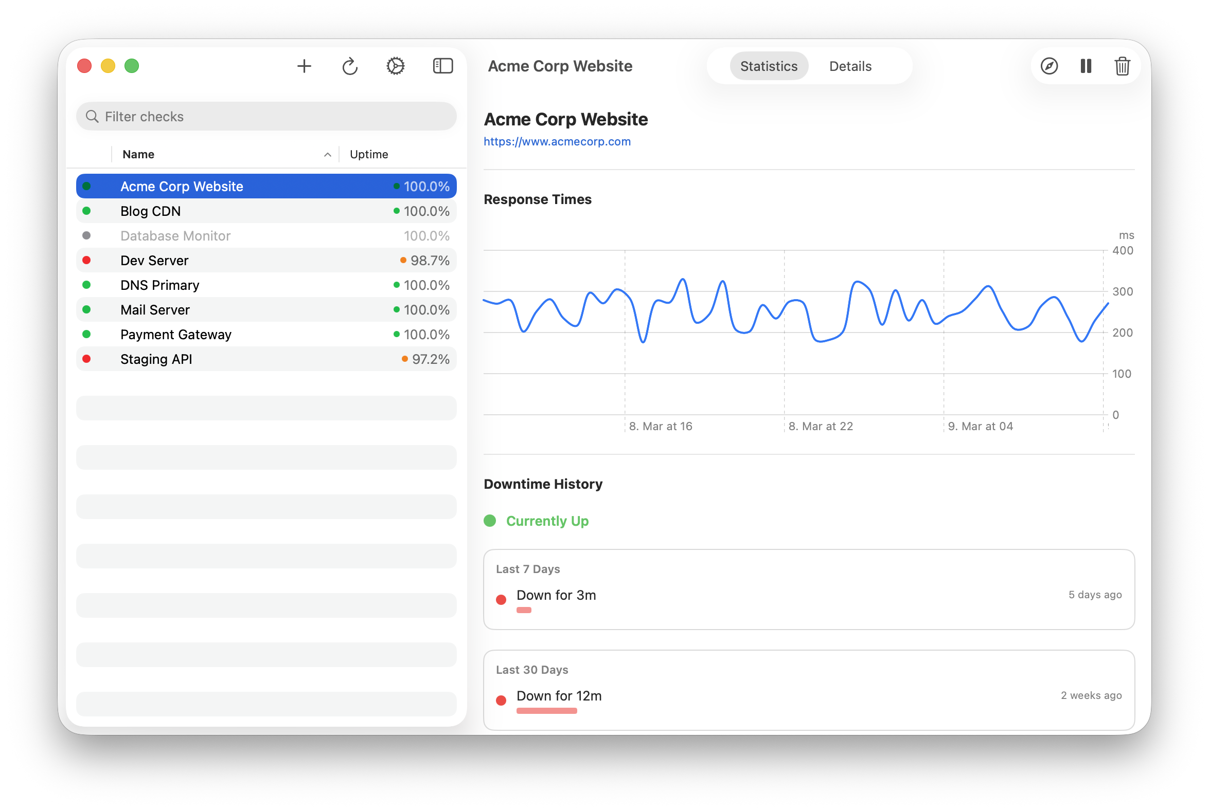 CakeWatch gives you a fast, native way to manage your StatusCake uptime monitors from macOS and iOS. No browser tabs, no slow dashboards — just your checks, right on your device.
